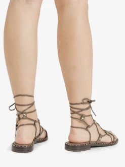 Lacci incrociati sul dorso e fascia borchiata frontale.