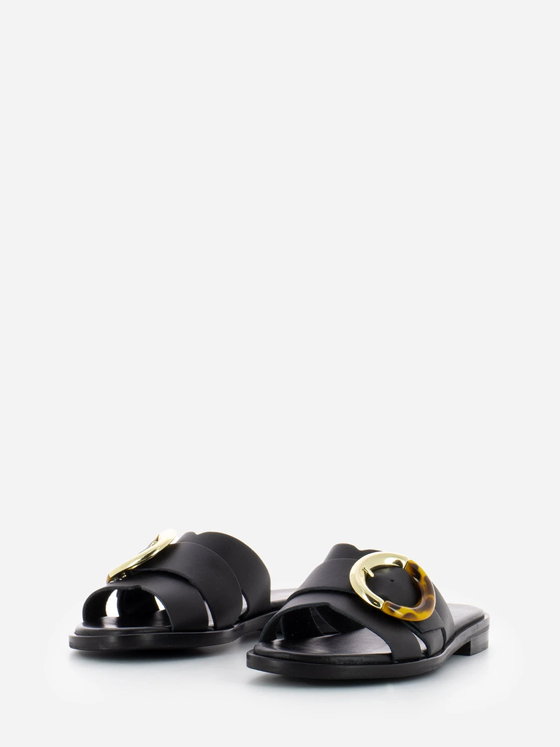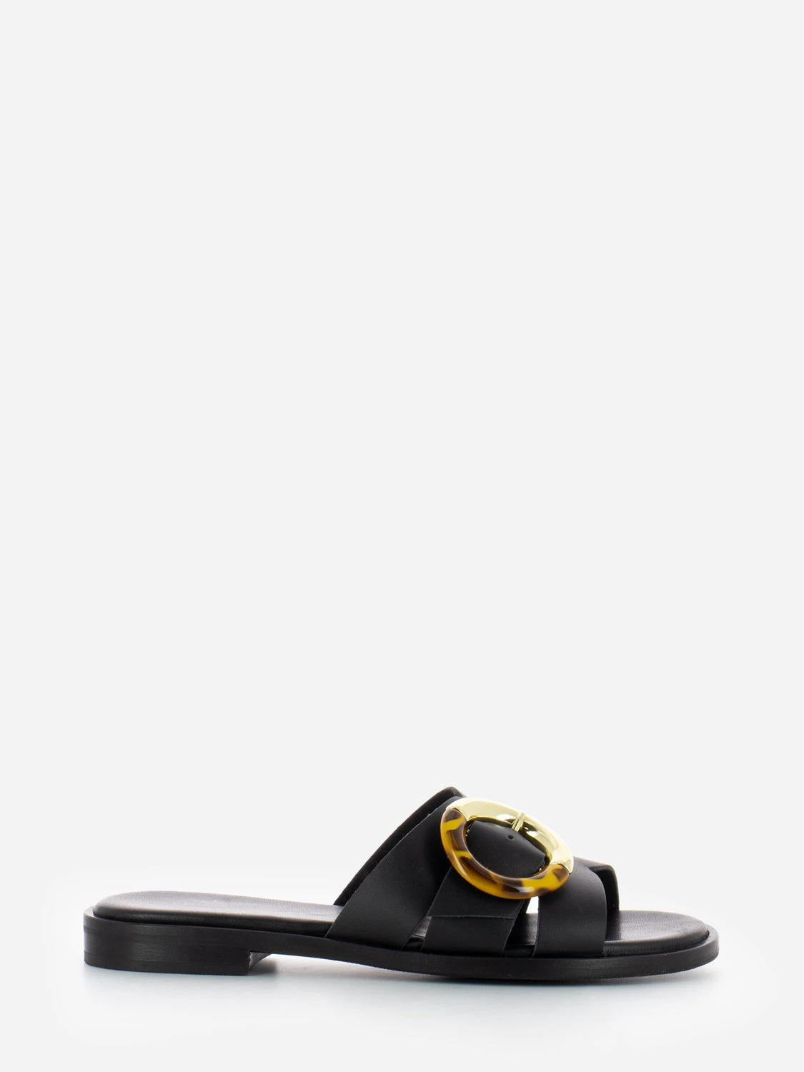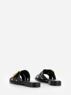 Fasce incrociate con maxi fibbia dorata ed effetto “turtle”.