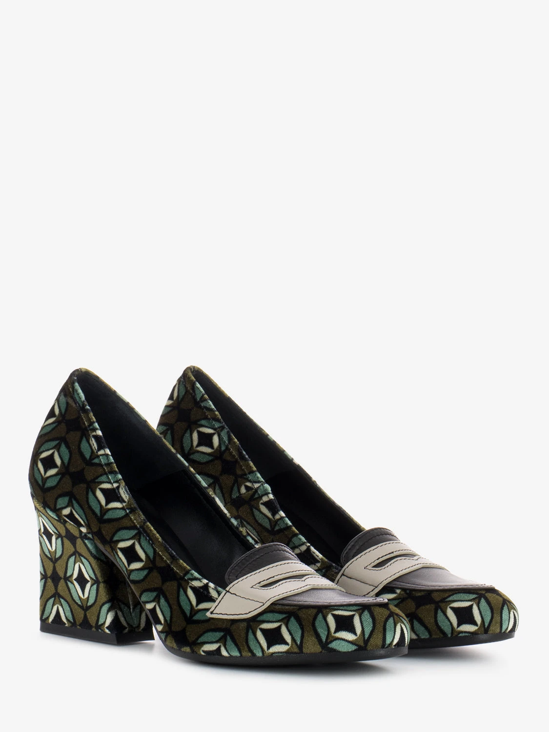 Tomaia in velluto a fantasia e pelle, interno in pelle.