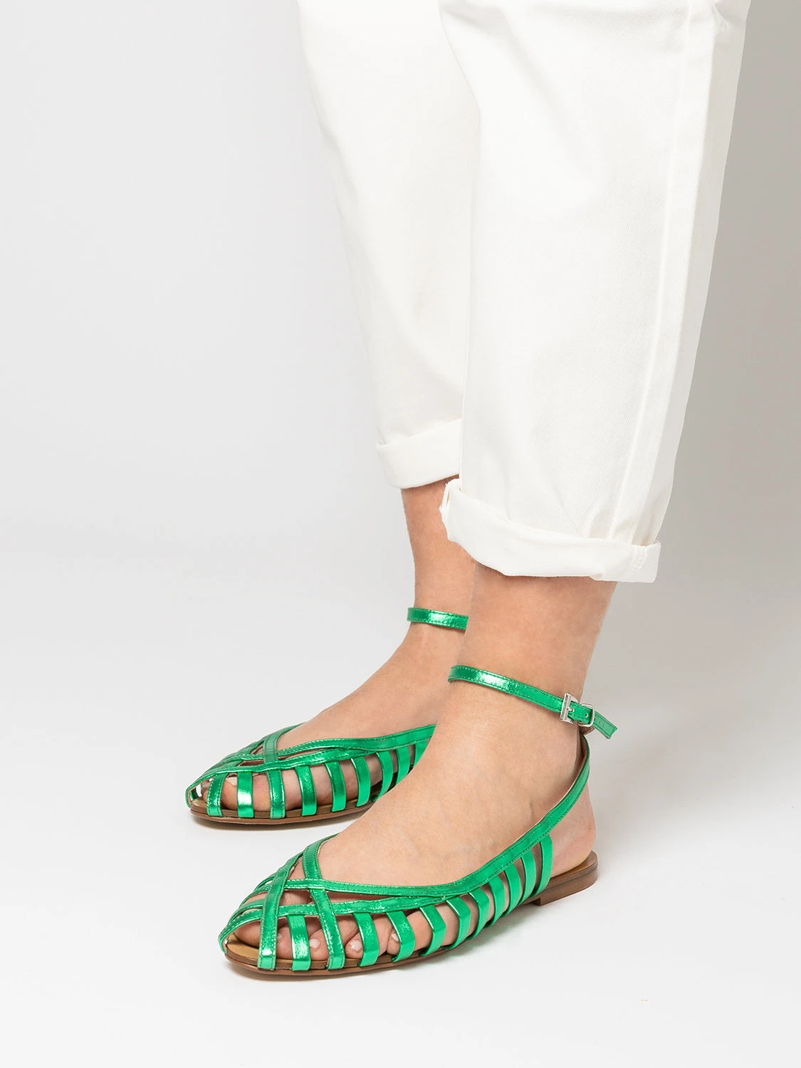 Pelle laminata a fasce sottili, pianta in pelle e fondo in cuoio.
