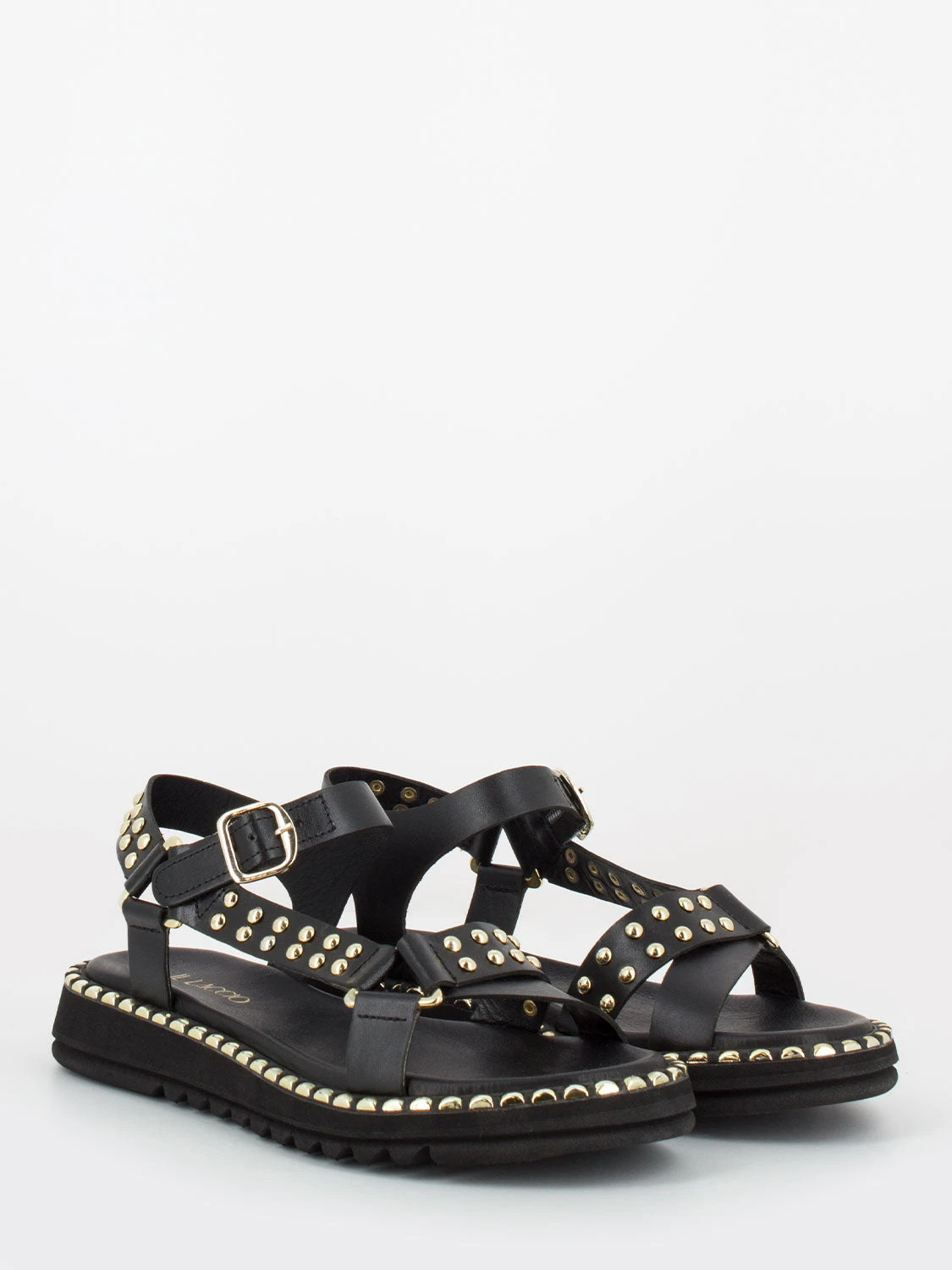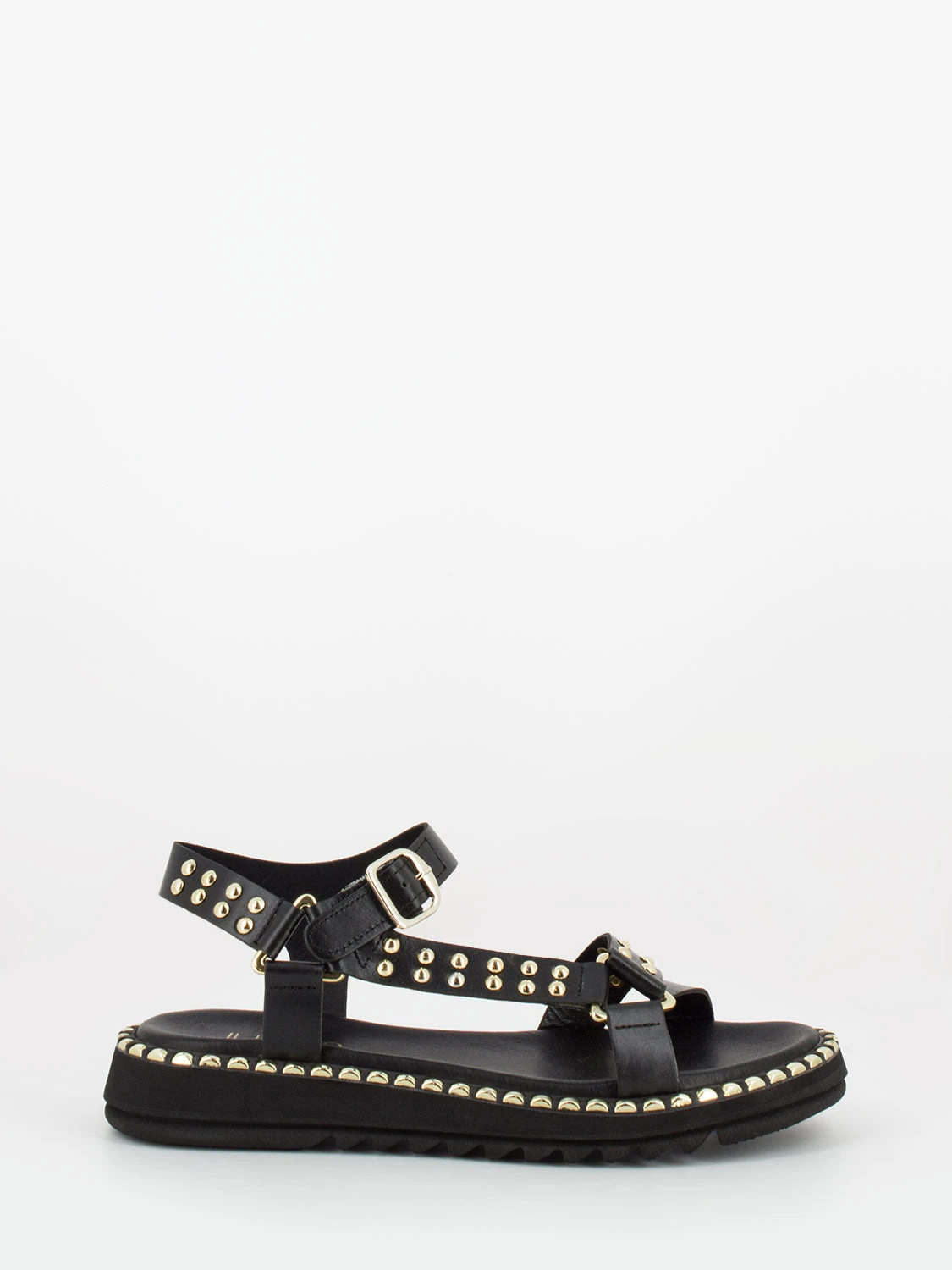 Borchie dorate tonde applicate su fasce e sul bordo del fondo.