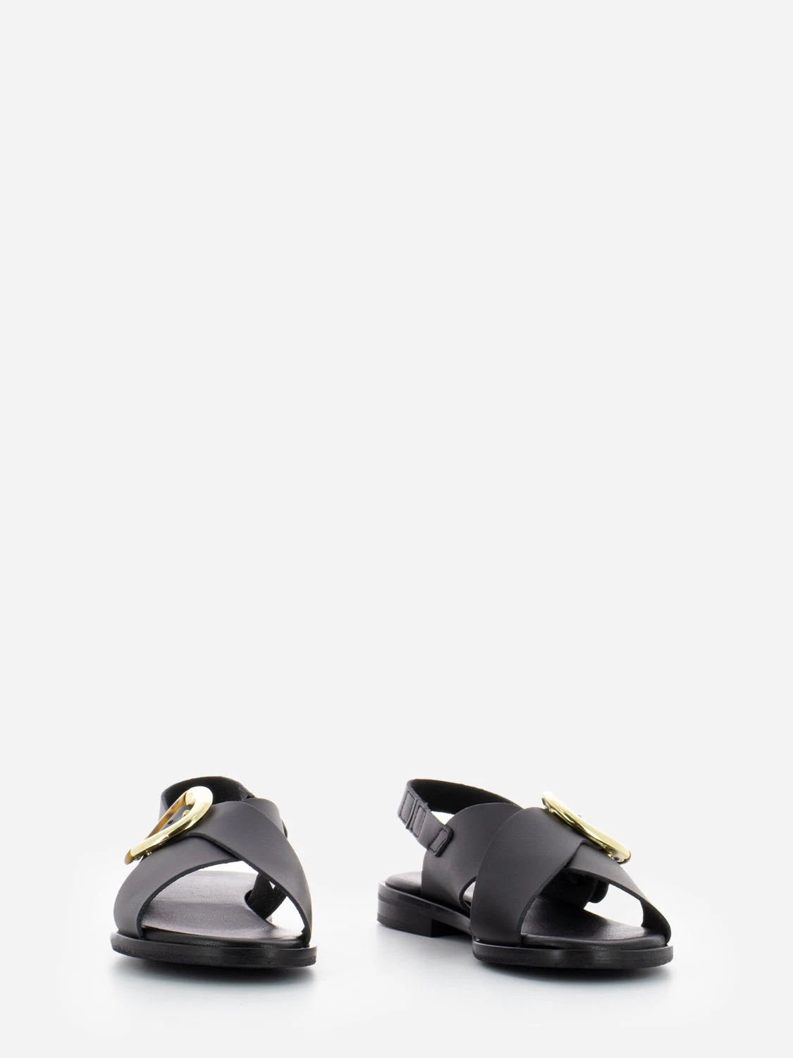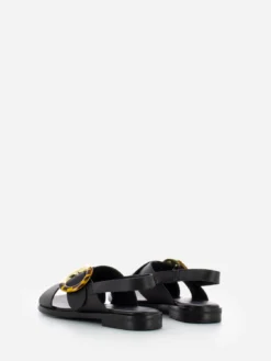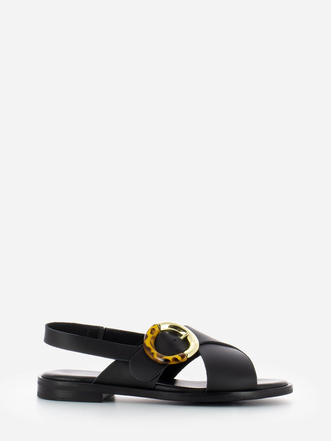 Fasce incrociate con maxi fibbia dorata ed effetto “turtle”.