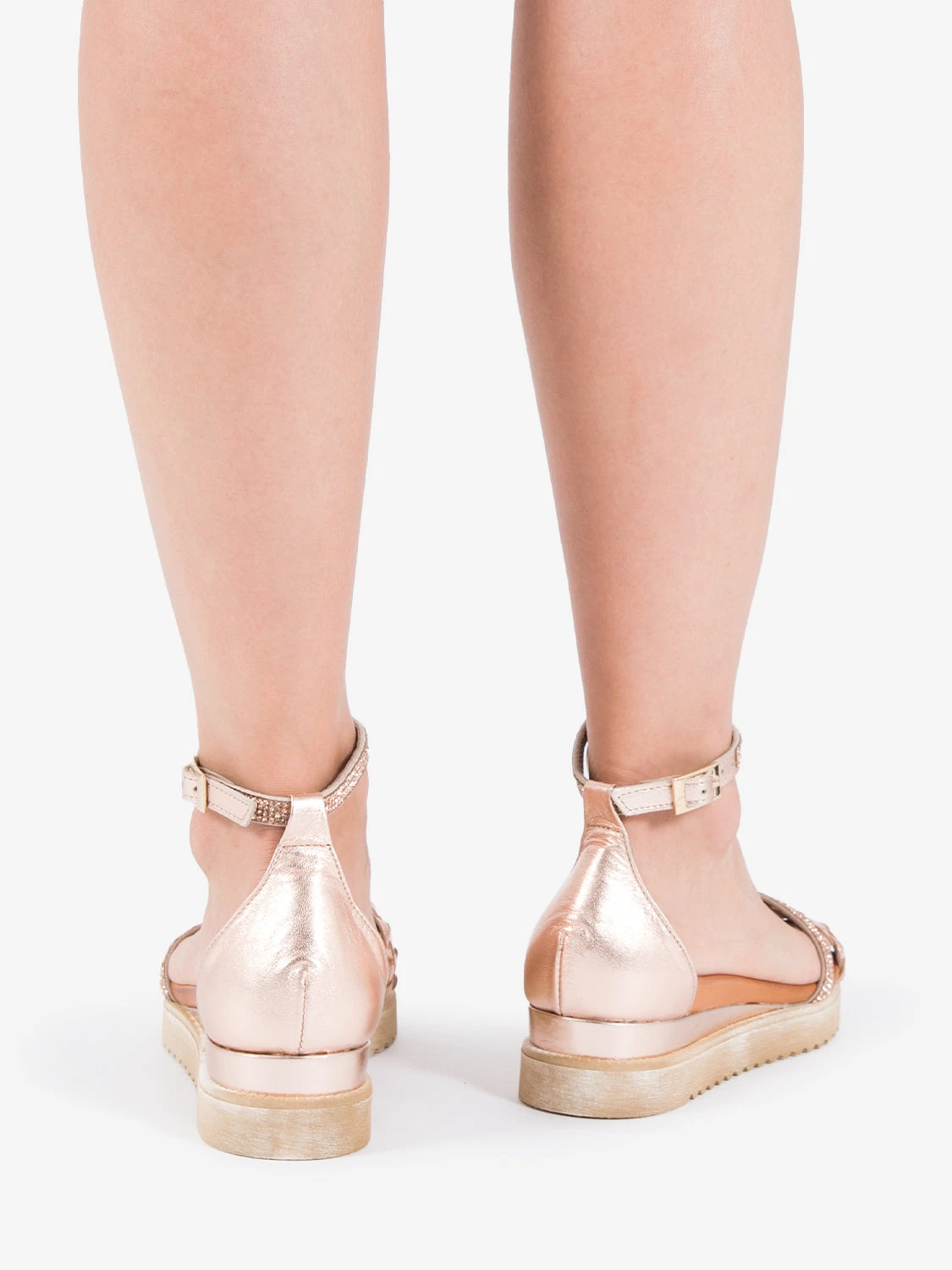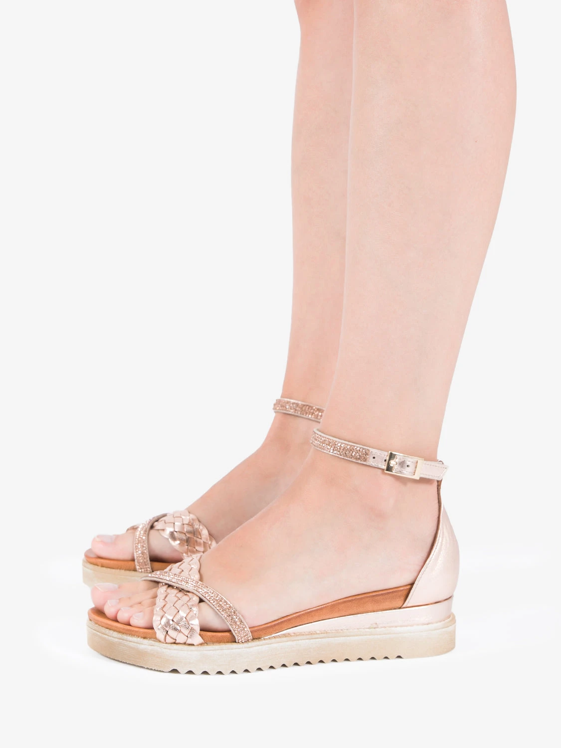 Fascia frontale intrecciata in pelle laminata e strass applicati.