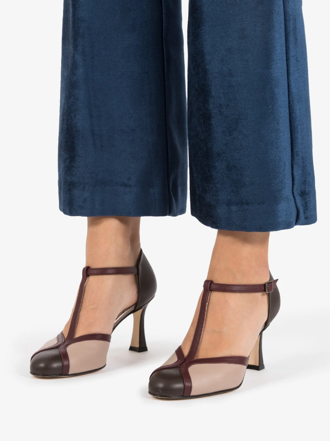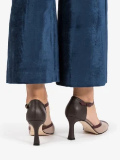 Tallone chiuso con cinturino laminato a T alla caviglia.