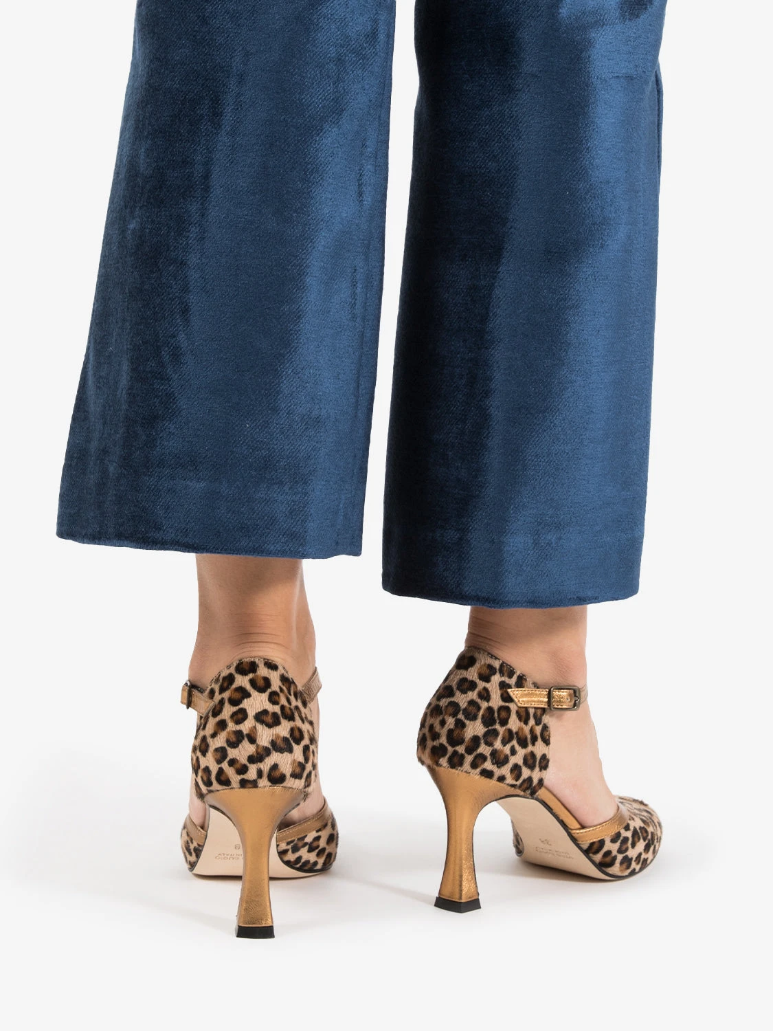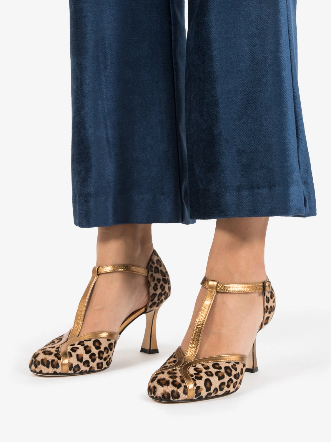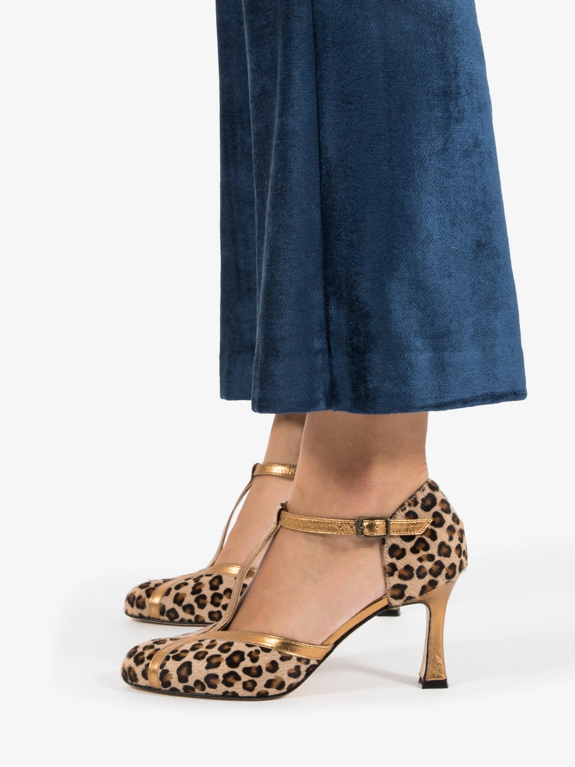 Tallone chiuso con cinturino laminato a T alla caviglia.